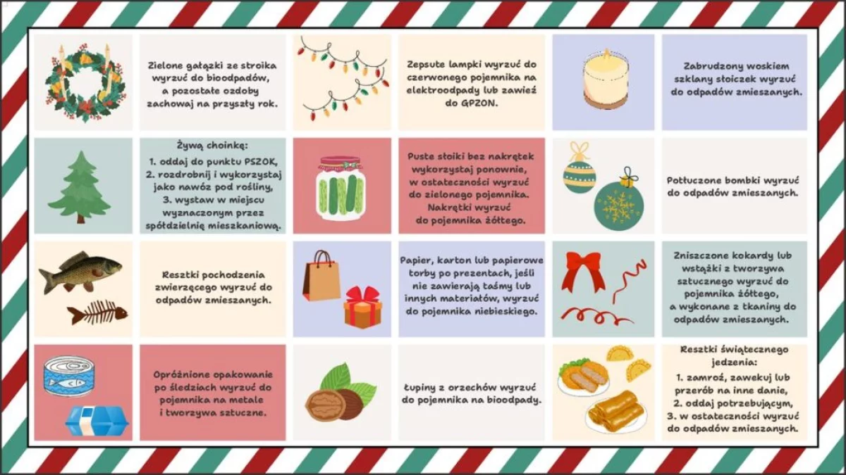 - Ozdoby i dekoracjeZielone gałązki ze stroika, jeśli nie zawierają sztucznych dodatków, powinny trafić na kompostownik lub do pojemnika na bioodpady. Z kolei stłuczone bombki niestety nie nadają się do recyklingu i należy je wyrzucić do odpadów zmieszanych. Zepsute lampki choinkowe, które nie nadają się do dalszego użytku, oddajemy do specjalistycznego pojemnika na elektroodpady lub zawozimy do PSZOK-u. Potłuczone bombki wrzucamy do odpadów zmieszanych.