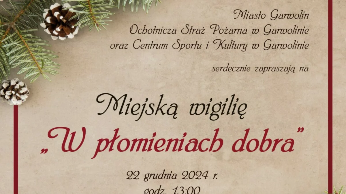 -Wigilia to czas bliskości i wspólnoty, a my, jako Ochotnicza Straż Pożarna, wiemy, jak ważne jest wspieranie więzi międzyludzkich. Przyjdźcie, by wspólnie przeżyć magię świąt i cieszyć się chwilą wśród sąsiadów i przyjaciół – mówi Roman Maszkiewicz, prezes Ochotniczej Straży Pożarnej w Garwolinie, który we współpracy z burmistrz miasta Marzeną Świeczak organizuje miejską wigilię pn. „W płomieniach dobra”. – Zbliżające się Święta Bożego Narodzenia to wyjątkowy czas, który sprzyja refleksji, wspólnym spotkaniom i dzieleniu się radością. Dlatego serdecznie zapraszam Państwa na naszą drugą już Wigilię Miejską, która odbędzie się w niedzielę o godz. 13.00 na skwerze Solidarności. Czekamy na Was z ciepłym posiłkiem, świątecznymi atrakcjami i uśmiechem. Dołączcie, by wspólnie stworzyć piękną tradycję naszego miasta. Niech to spotkanie stanie się symbolem jedności i nadziei na kolejny, dobry rok. – zachęca włodarz Garwolina.