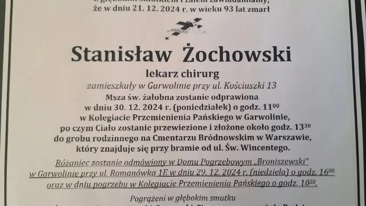 Uroczystości pogrzebowe śp. doktora Stanisława Żochowskiego odbędą się w poniedziałek 30.12.2024 r. Rozpoczną się mszą świętą pogrzebową o godzinie 11:00 w Kolegiacie Przemienienia Pańskiego w Garwolinie. Pochówek odbędzie się na Cmentarzu Bródnowskim w Warszawie około godziny 13:30.