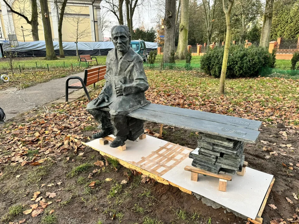 Ławka z podobizną Białoszewskiego powstała w pracowni lokalnego artysty rzeźbiarza Grzegorza Mikulskiego.