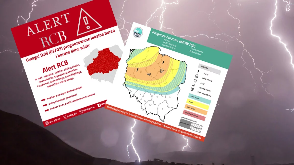 Rządowe Centrum Bezpieczeństwa wysłało też do mieszkańców ALERT RCB o treści: "Uwaga! Dziś (02.05) prognozowane lokalne burze i bardzo silny wiatr. W trakcie burzy znajdź bezpieczne schronienie. Sledź komunikaty pogodwe."