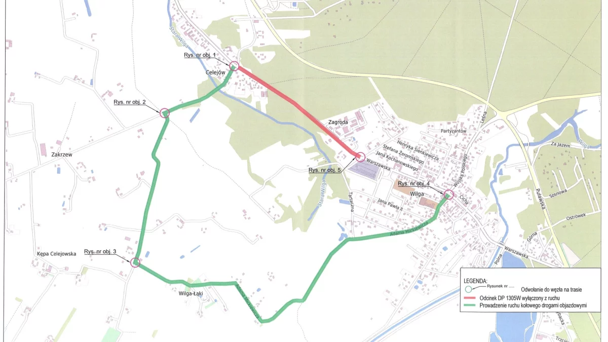 Na czas prowadzonych robót wyznaczono objazdy, które będą przebiegać drogą powiatową nr 1304W oraz drogami gminnymi przez miejscowości Celejów, Zakrzew i Wilga. Organizacja ruchu została przygotowana zgodnie z zatwierdzonym projektem czasowej organizacji ruchu. Objazd przewidziano wyłącznie dla pojazdów o dopuszczalnej masie całkowitej do 3,5 tony.