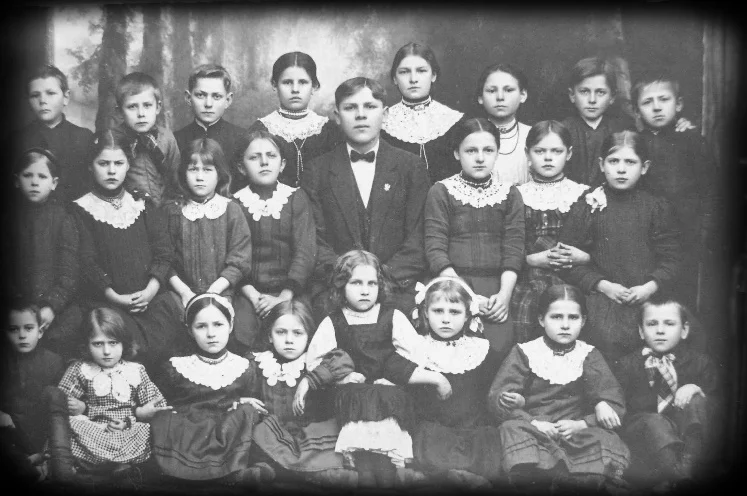 Proszę popatrzeć na zdjęcie - wojna, Wielka Wojna zwana po latach Pierwszą Wojną Światową a dziewczynki mają haftowane, białe kołnierzyki, dzieci czują się swobodne, zaprzyjaźnione, nauczyciel jest w środku i tylko tym jest najważniejszy, gesty przyjaźni między uczniami, dzieci patrzą w obiektyw pewne siebie.