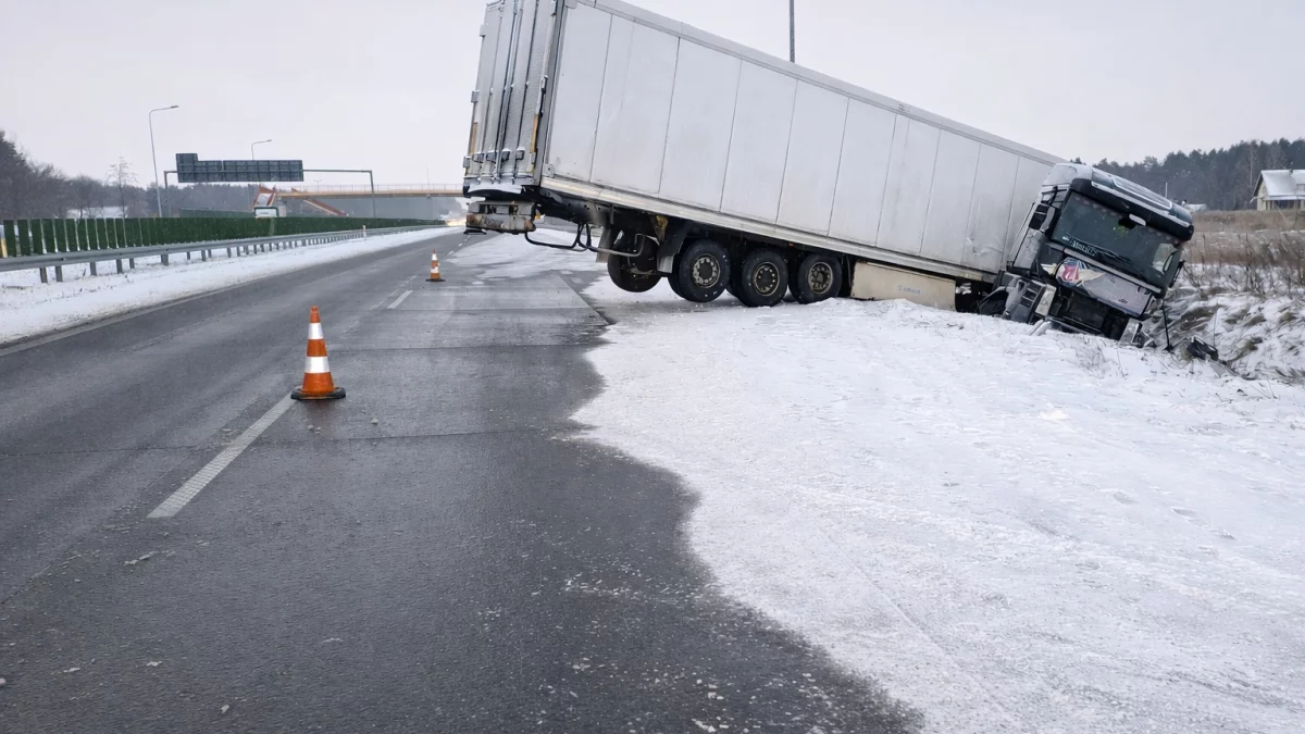 Dziś około godziny 6:00 na drodze ekspresowej S17 w miejscowości Józefów, w kierunku Lublina, doszło do zdarzenia drogowego z udziałem samochodu ciężarowego z naczepą. Ze wstępnych ustaleń policjantów pracujących na miejscu wynika, że kierowca pojazdu nie dostosował prędkości do panujących nad ranem trudnych warunków drogowych. Na skutek poślizgu ciężarówka zjechała do przydrożnego rowu, a część naczepy wystaje na pas rozbiegowy oraz fragment prawego pasa ruchu.