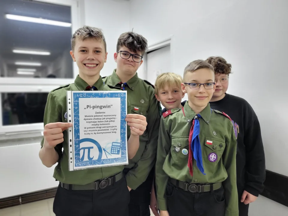 Na harcerzy czekał szereg zadań m.in.: Pi-ngwin (czy umiesz poruszać się jak pingwin?), tworzenie opowiadania z wyrazami zawierającymi "pi", obliczanie obwodu ciasteczka i gra czółko – oczywiście z pi-słowami.