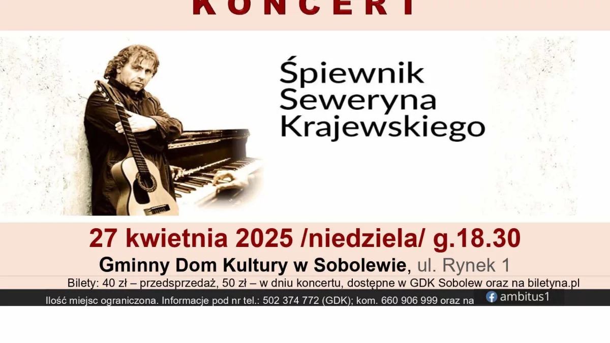 Wszystkich miłośników twórczości Seweryna Krajewskiego zapraszamy na wyjątkowy koncert, który odbędzie się w niedzielę 27 kwietnia o g.18.30 w Gminnym Ośrodku Kultury w Sobolewie, Sobolew, ul. Rynek 1