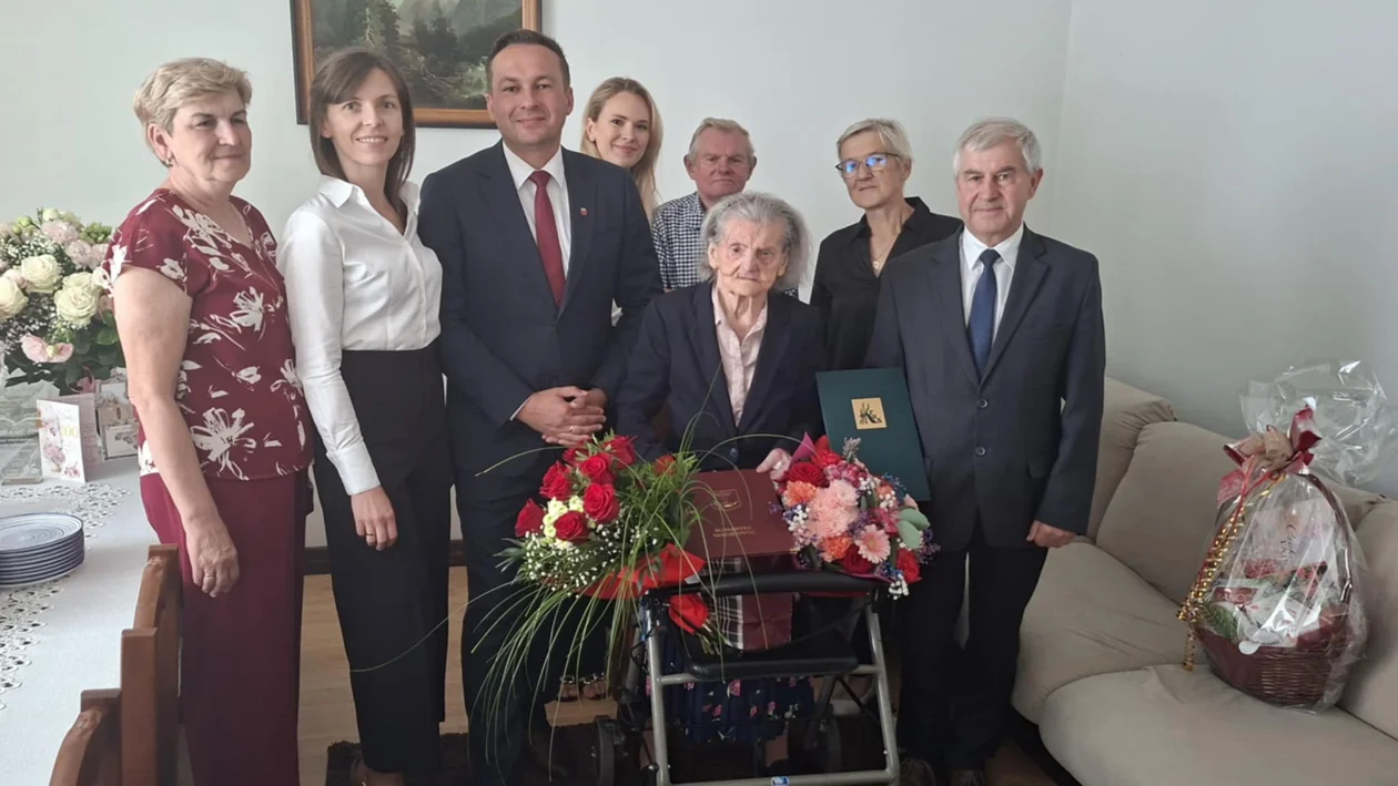 Burmistrz Maciejowic Tomasz Kwiatkowski oraz Zastępca Burmistrza Beata Rulak-Fryc wraz delegacją: Dyrektorem MGOPS, Kierownikiem USC, Sołtysem wsi Wróble-Wargocin, Kierownikiem Placówki Terenowej KRUS w Garwolinie udali się z wizytą do Jubilatki.