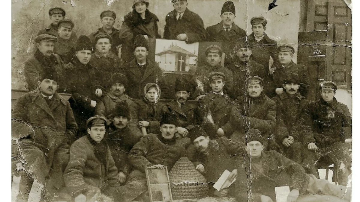Kurs pszczelarstwa w Miętnem. Około 1928 roku. Jak widać kurs był organizowany zimą a uczono gospodarki pszczelej zarówno w ulach ramkowych jak i kuszkach [kószkach]. Strzałka wskazuje na Kazimierza Witaka.