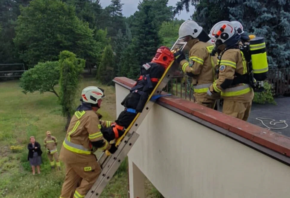 W drugim scenariuszu założeniem ćwiczeń był pożar na piętrze obiektu oraz odnalezienie osoby poszkodowanej znajdującej się w budynku. Podczas odnalezienia i ewakuacji osoby poszkodowanej schody uległy zawaleniu co zmusiło strażaków do szukania alternatywnej drogi ewakuacji przez balkon.