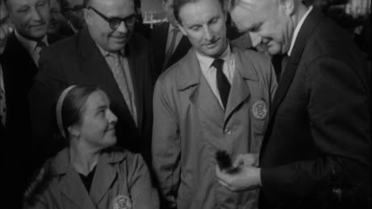 Lektor: "Wicepremierowi Jaroszewiczowi podano nożyczki z pozłacanym uchwytem. Nic dziwnego, że takie powitanie. Kilkaset osób znajdzie pracę, na którą czekano bez przesady od stuleci (Piotr Jaroszewicz przecina wstęgę). Miejscowi gospodarze za darmo oddali grunt pod inwestycję. Wytwórnia wyrobów z tworzywa sztucznego. Wartość produkcji 120 milionów złotych rocznie – dla małej osady oszałamiająca kariera (Jaroszewicz w towarzystwie swojej świty przybywa do hali produkcyjnej; wicepremier prowadzi rozmowy z pracownicami). Już gotowe pierwsze płaszcze z plastiku, jak nasz budżet zręcznie przykrojone i trochę ciasne pod pachami (Piotr Jaroszewicz przymierza płaszcz) (...)".