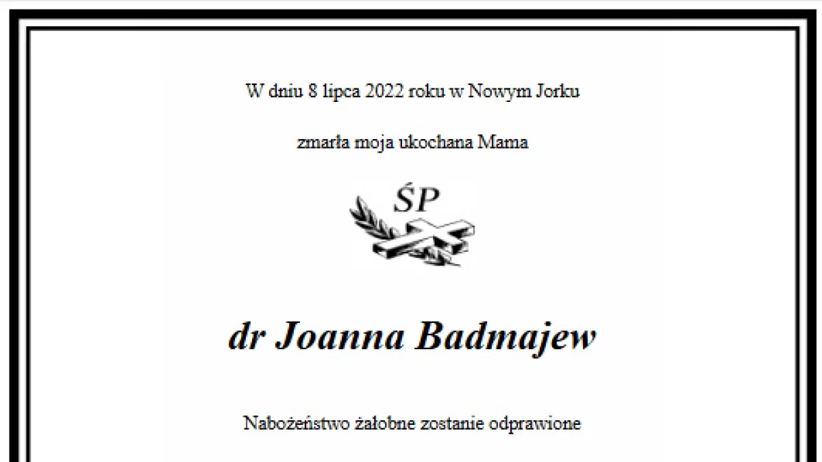 Joanna pozostawiła po sobie ojca Piotra Badmajew i córkę Karolinę Wojtasik, a także brata Dr. Wolicka Badmaev i bratanka Dr. Michała Badmaev." - czytamy w Dzienniku Polonijnym, który informował o śmierci dr Joanny Badmajew.