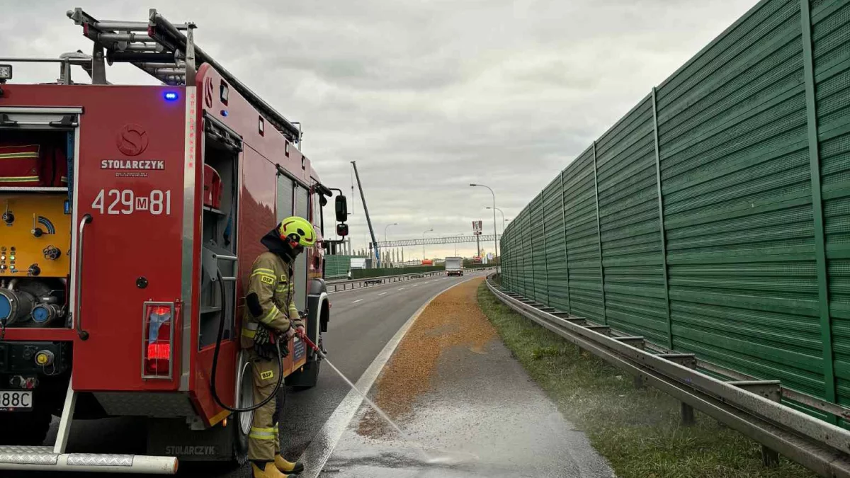 O godz. 7.42 służby otrzymały zgłoszenie, że na drodze ekspresowej S17 w kierunku Lublina z pojazdu ciężarowego wypadły wytłoki jabłkowe, czyli pozostałość po tłoczeniu jabłek na sok lub cydr, składająca się z miąższu, skórek i pestek.