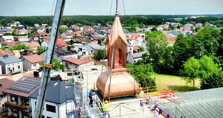 Ostatni etap, czyli zamontowanie drewnianych wieżyczek pokrytych blachą miedzianą na szczytach odbudowanych wież kościelnych dobiegł właśnie końca. Krzyże, które zostały usytuowane na zwieńczeniach wieżyczek będą podświetlane. Konstrukcja została również wyposażona w system odgromowy, który ma zapobiegać ewentualnym uszkodzeniom budowli w wyniku wyładowań atmosferycznych. Odnowiono także elewację frontową kościoła.